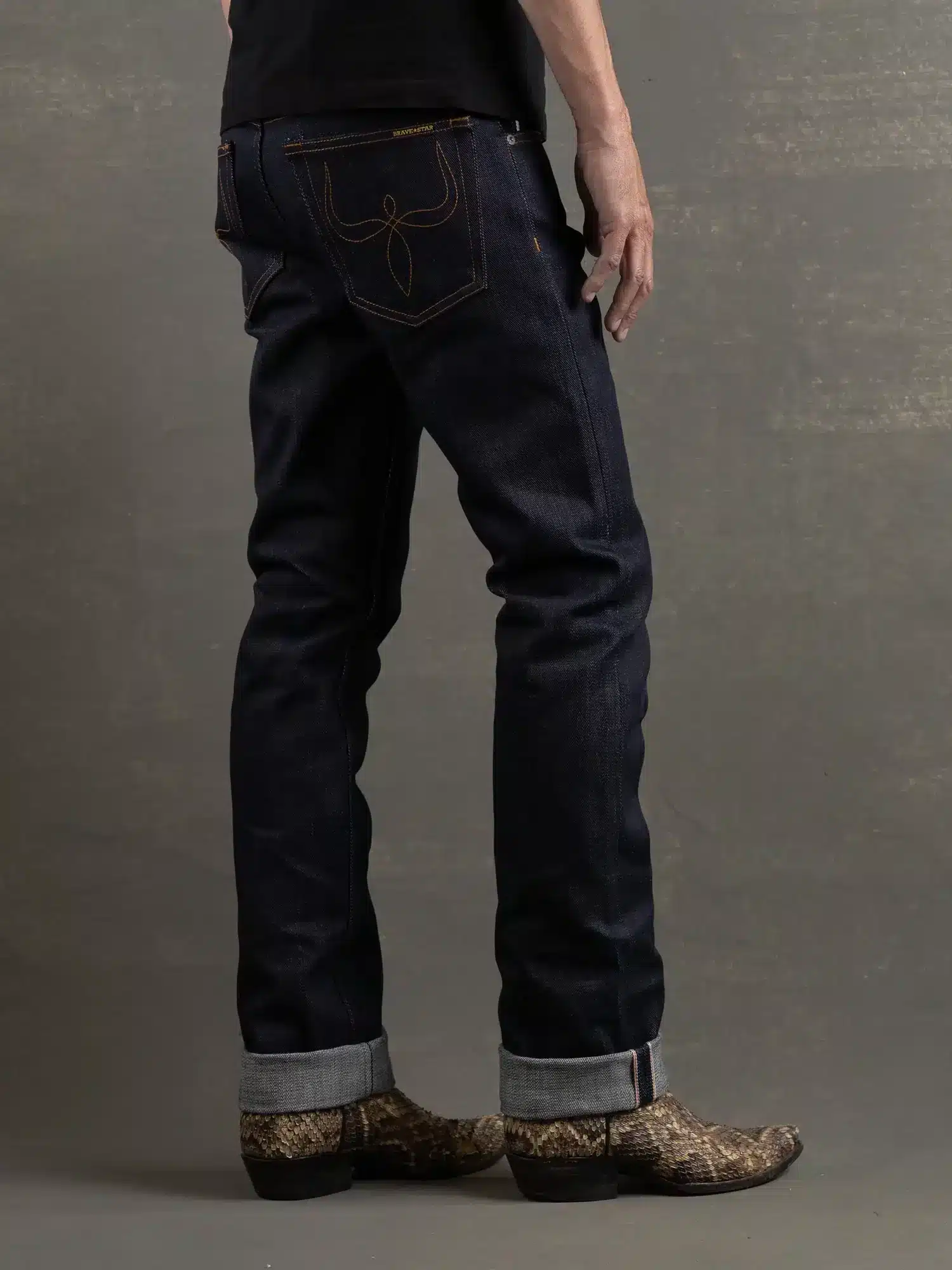 At a solid 21.5 oz., these are not for casual wearers. Woven with rope-dyed indigo and a 3×1 left-hand twill, the fabric feels like denim armour at first. However, thanks to long-staple cotton, it softens after only a couple of weeks, making it far more wearable than its weight would suggest.
