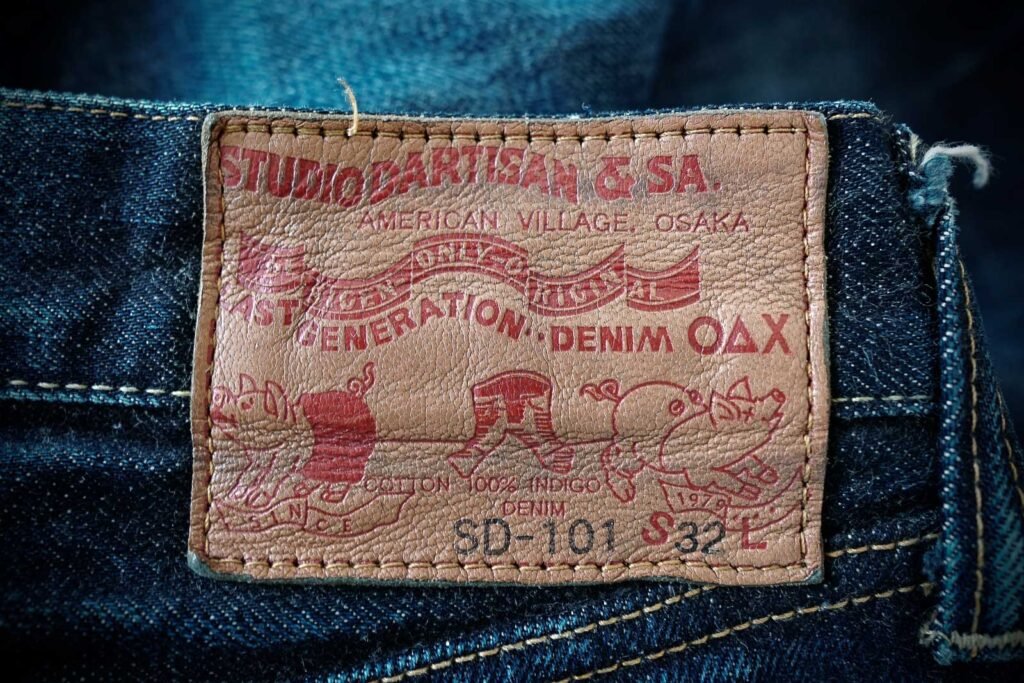 Studio D’Artisan brand patch with two pigs pulling jeans apart
