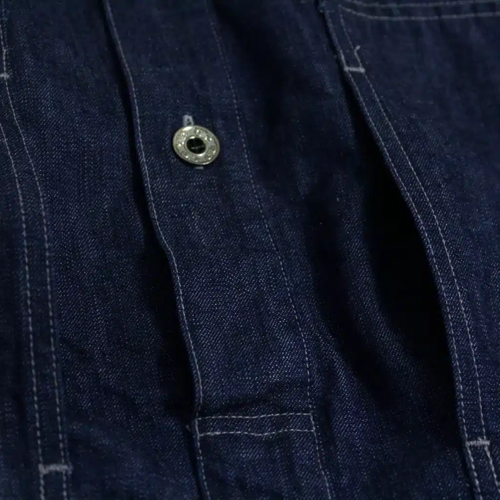 The subtle details allow the gorgeous 8 oz. Zimbabwe cotton denim to take centre-stage here. The thread contrasts, but the colour difference is subtle. Dark blue tonal buttons match the deep indigo colour of the selvedge. Of course, there’s also chain stitch runoff for bonus authenticity points.