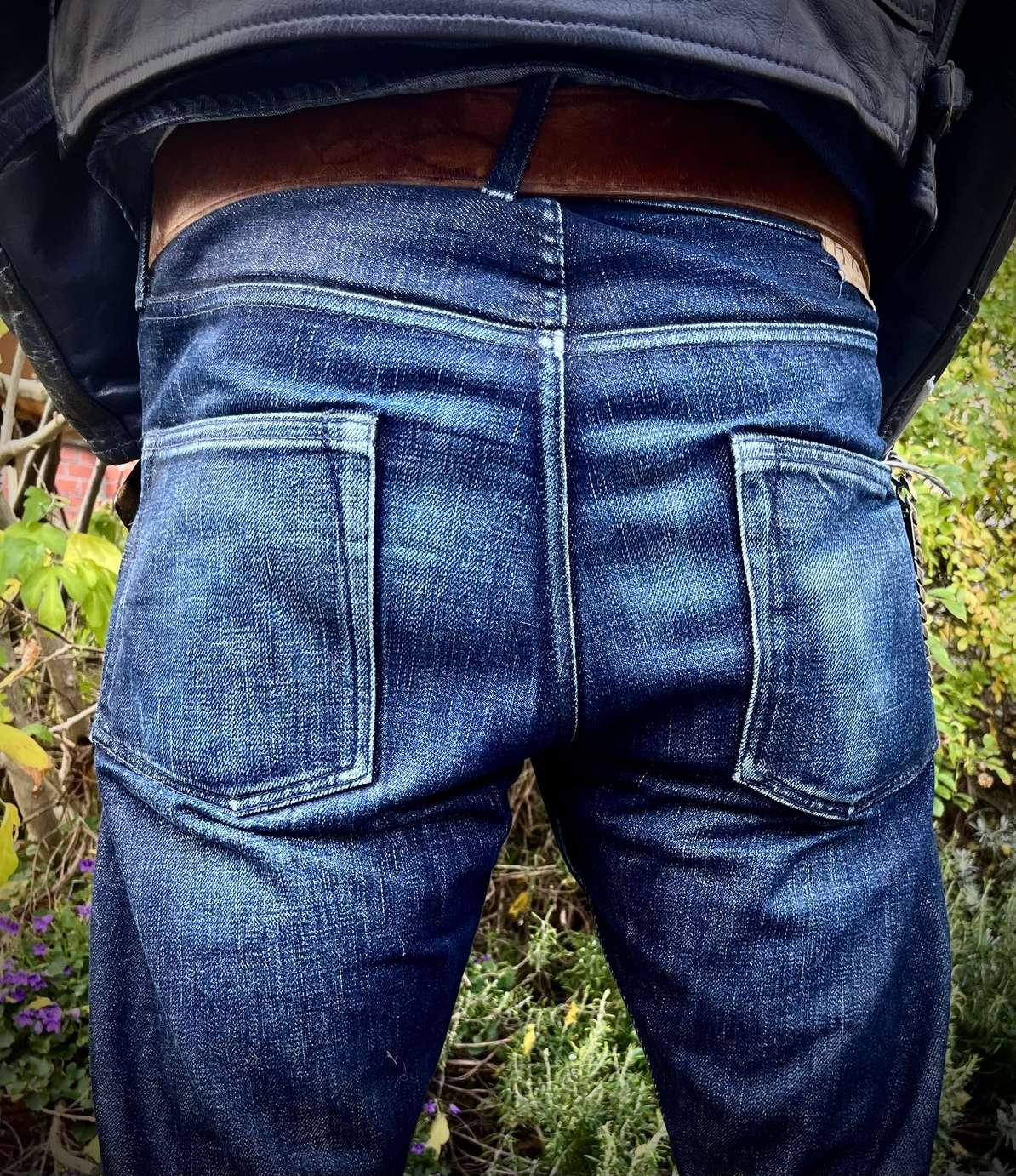 Instead of using contrasting straw- or tobacco-coloured thread, they have opted for dark blue thread throughout their line. When the jeans are brand new, the stitching is practically invisible. As they age, this conscious design choice becomes a more conspicuous one..