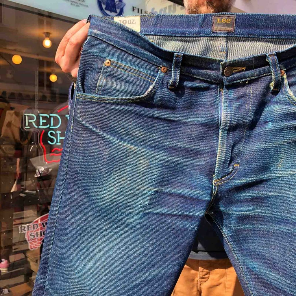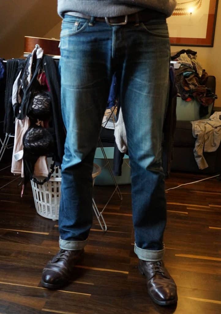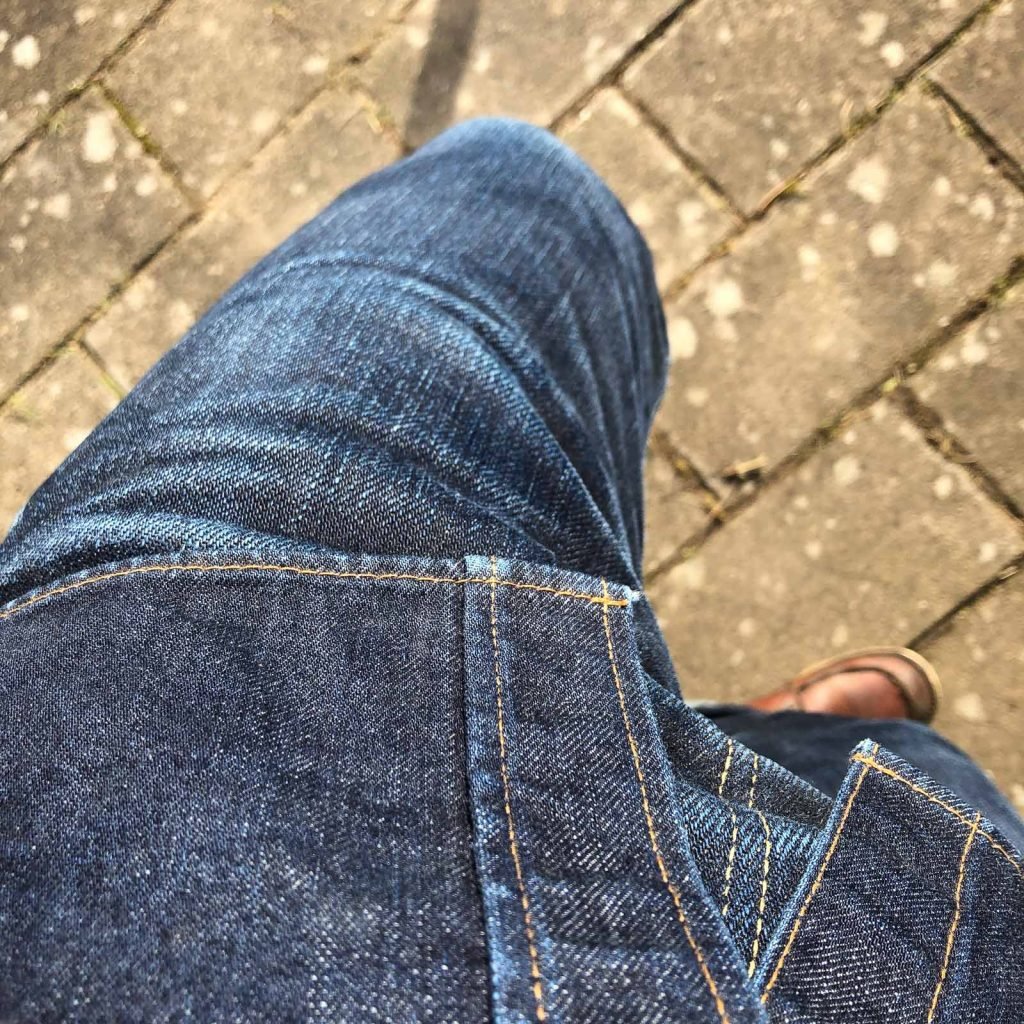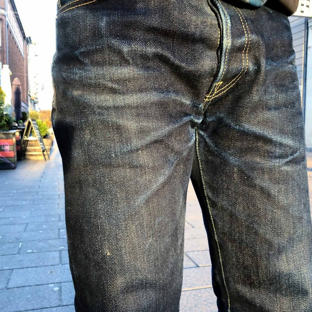 Brand new selvedge simply doesn’t photograph well from a distance. We can get an idea of the cut, but, until you get up close, the denim is simply too dark to reveal anything of interest to the viewer.