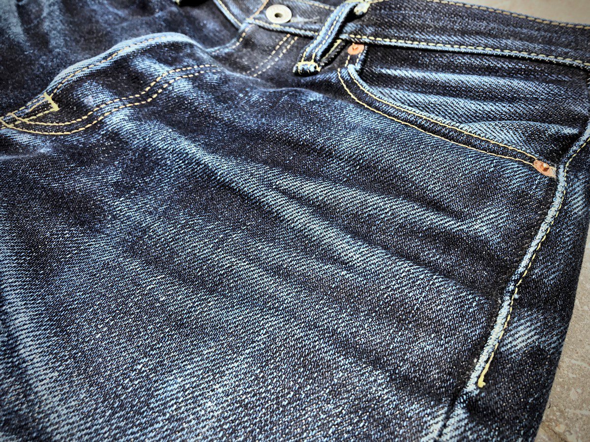 Brand new selvedge simply doesn’t photograph well from a distance. We can get an idea of the cut, but, until you get up close, the denim is simply too dark to reveal anything of interest to the viewer.