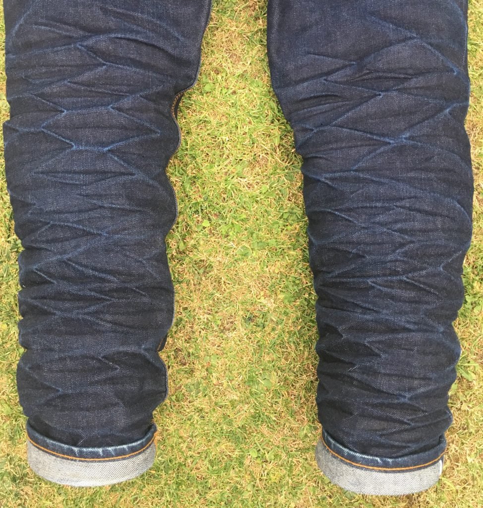 He found his competition pair (Naked & Famous Elephant 2 Revenge Weird Guy) online shortly before the competition started, and he’s been thrilled with the results so far. His pair has developed vertical electric blue fade lines below the pockets, and he’s just given them their first wash (they were so filthy that the grime was concealing the fades that were starting to emerge).