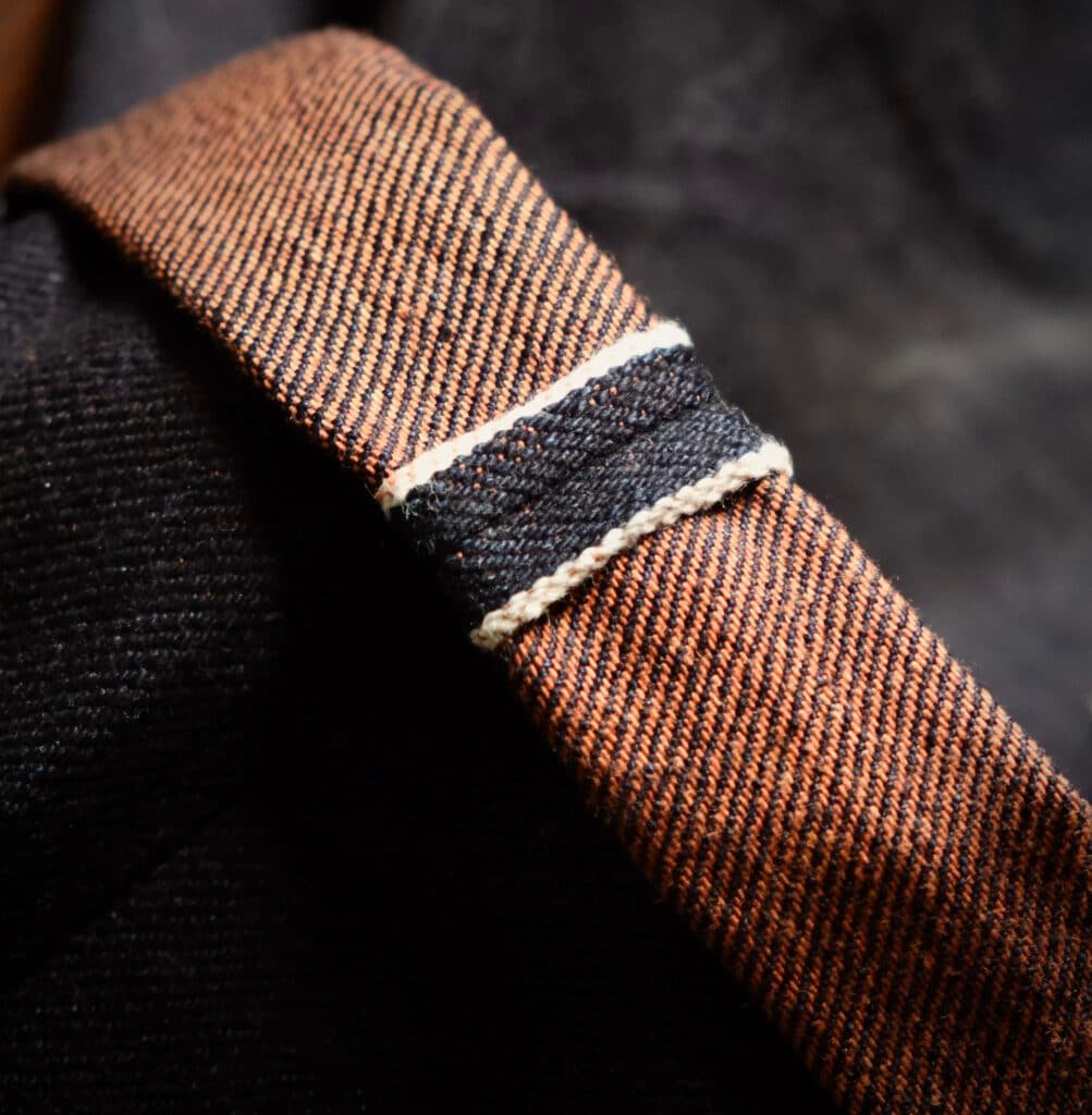 The selvedge (designed in Thailand but woven in Japan) features an intoxicating mixture of blue and orange tones—the result of a marriage of indigo-dyed warp yarns and soil- and bark-dyed weft yarns.