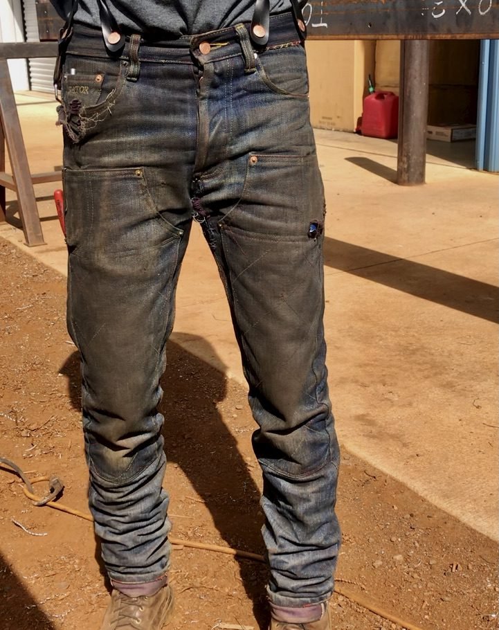 The purple weft is bleeding through in a few places, and you can see rich blue tones beneath the thick layer of dirt and grime that Logan has accumulated. The denim is clearly tough enough to take just about anything you can throw at it in stride, but the purple weft gives it a playful side.